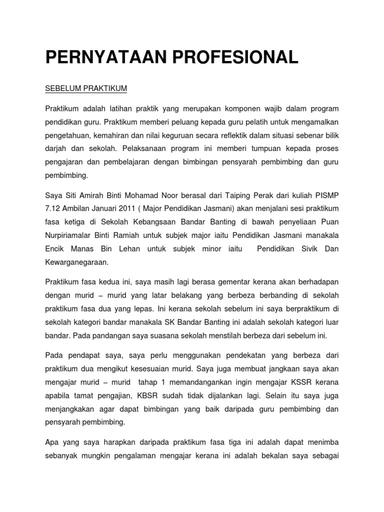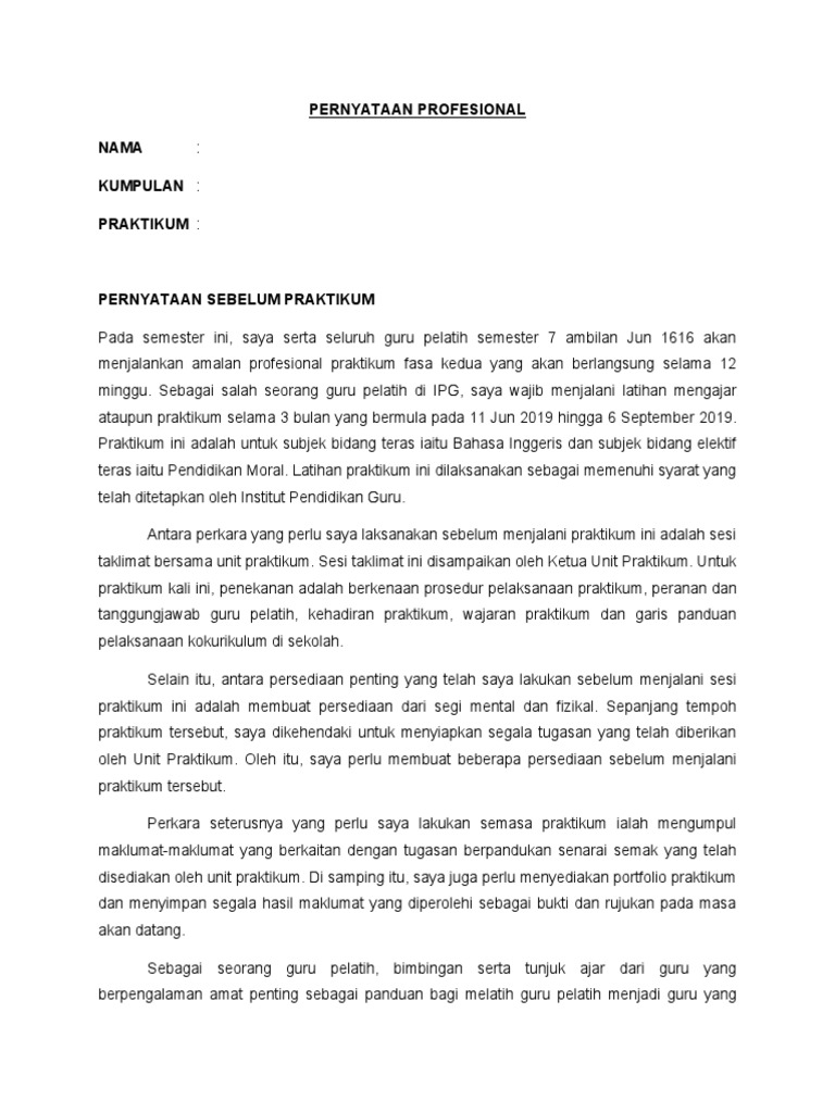 Praktikum fasa satu dan dua yang lepas telah. 2.2 menilai semula keberkesanan tugas dan tanggungjawab yang telah dijalankan. Pernyataan profesional / harapan 3. Unduh sebagai docx, pdf, txt atau baca online dari scribd. View pernyataan profesional semasa.docx from jip pbk3123 at ipg kampus bahasa melayu.