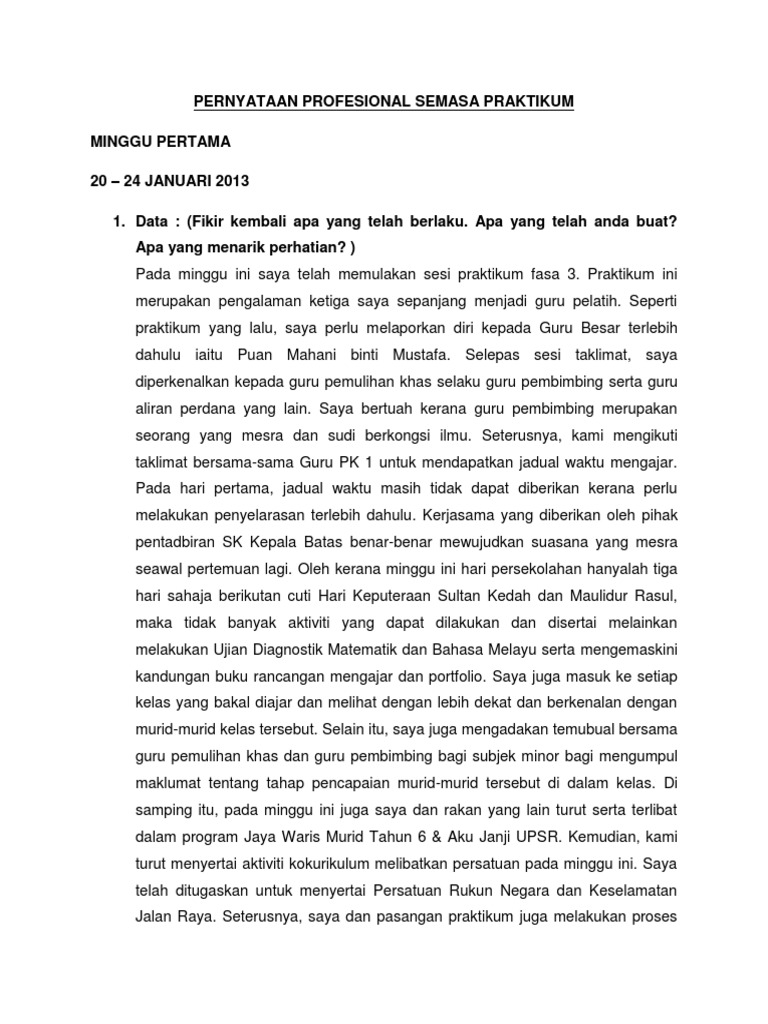 Penyataan profesional praktikum fasa 1 2011. Penyeliaan yang diterima semasa menjalani praktikum. Setelah selesai menjalani praktikum fasa 1 dahulu, saya merasa lebih yakin untuk menjalani praktikum kali ini. Membolehkan pelajar mengukur dan menilai keberkesanan pelaksanaan aktiviti yang difokuskan. Format dan contoh penulisan jurnal. 3.3 selepas pbs (refleksi) a. 2.3 menggunakan jurnal reflektif sebagai asas/panduan untuk tindakan susulan bagi menyelesaikan masalah yang difokuskan dan seterusnya meningkatkan Pernyataan profesional praktikum fasa 2 sebagai seorang guru pelati, bimbingan serta tunjuk ajar dari guru yang berpengalaman amat penting dalam melatih guru pelatih menjadi guru yang berjaya.sehubungan dengan itu, saya perlu berbincang dan sentiasa meminta tunjuk ajar dari guru pembimbing saya dari sekolah tersebut.nasihat serta bimbingan yang padu amat penting kepada saya sebagai seorang guru praktikal yang baharu di sekolah tersebut. A) penyeliaan hendaklah berasaskan pencerapan klinikal. Semester 7 tahun 2014 merupakan kesinambungan program praktikum yang telah saya lalui pada semester lepas dan praktikum fasa tiga ini dan yang terakhir sebagai guru pelatih di institut pendidikan guru (ipg) diharapkan dapat mengukuhkan lagi kompetensi saya dalam bidang ini. Pdf profesionalisme guru pelatih pendidikan agama rahmah ag besar academia edu. Unduh sebagai docx, pdf, txt atau baca online dari scribd. Pernyataan profesional / harapan 3.